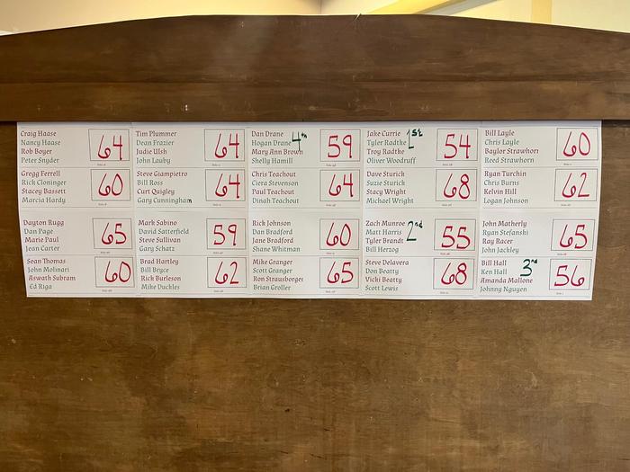 The scores were unexpectedly low. We had 20 foursomes and paid four places, all of which finished in the 50's. The highest score was 68, still under par The winners at an unbelievable 54 (18 under par) were Jake Currie, Tyler Radtke, Troy Radtke, and Oliver Woodruff. See all the scores and a few pictures of those at lunch below.